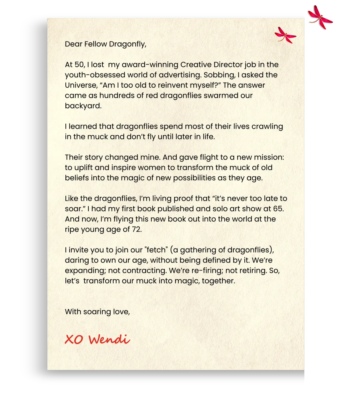 In a world that tells us to shrink, fade or fight the clock as we get older, The Way of the Dragonfly offers a fresh flight path. With humor, heart and wisdom, you are invited to reframe aging as a process of Becoming More of Who You are, Not Less of What You Were.